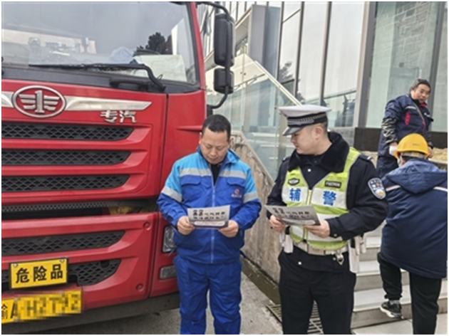 近日,市公安局交通管理总队高速公路第一支队九龙坡大队民警深入辖区重点运输企业,开展春节前交通安全宣传走访活动,拧紧企业安全“阀门”。