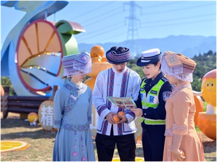 金果飘香季,采摘正当时。石柱县王场镇的伦晚脐橙与沃柑喜迎丰收,吸引众多游客前来体验采摘乐趣。为保障游客出行安全,石柱县公安局交通管理大队启动“三位一体”勤务模式,将警务前移至采摘一线,开展交通安全主题宣传,为丰收季筑牢安全防线。