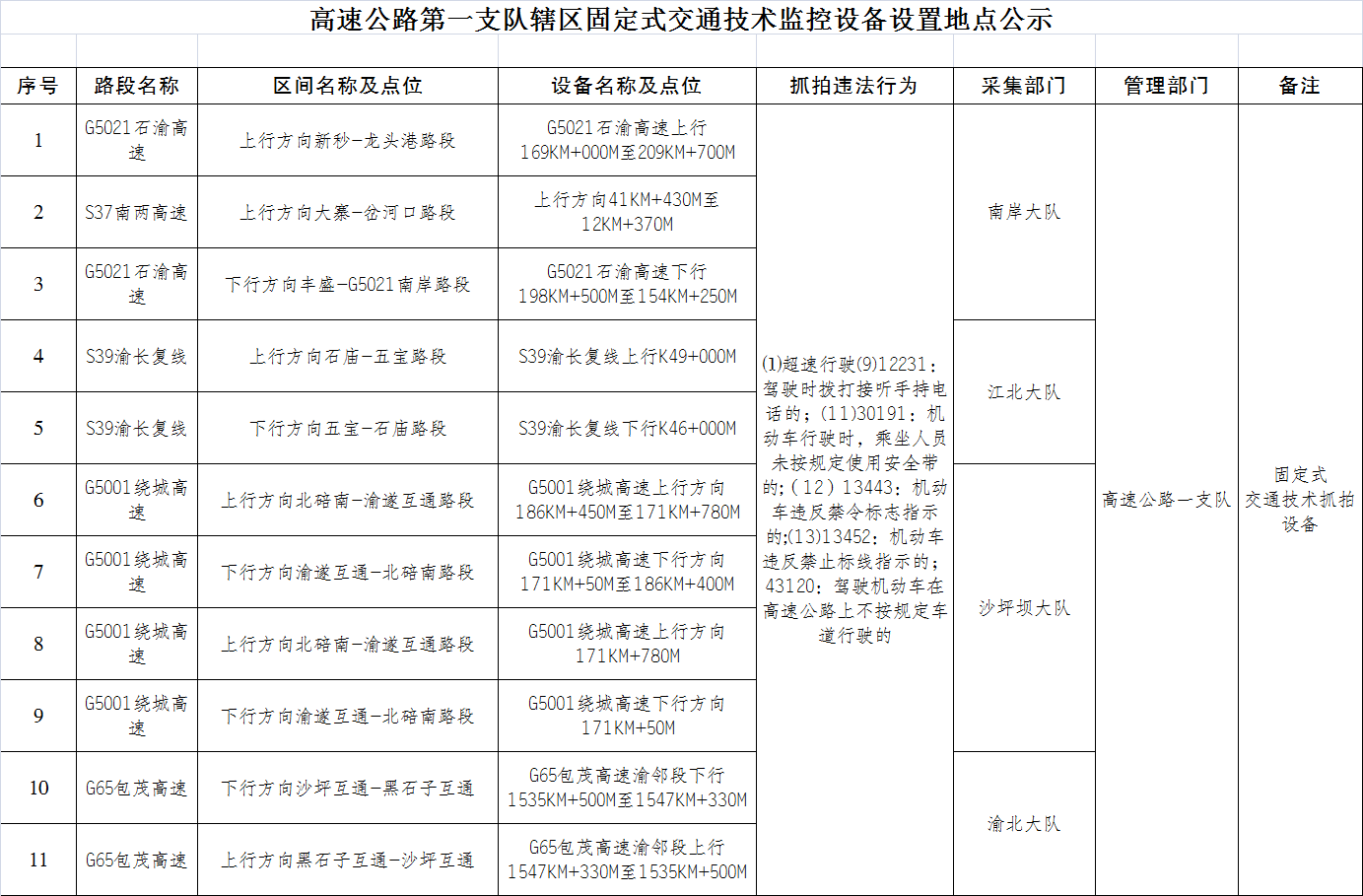 根据公安部《道路交通安全违法行为处理程序规定》(第157号令)第十六条第二款规定,现将高速公路固定式交通技术监控设备设置地点予以公布,详见下表。