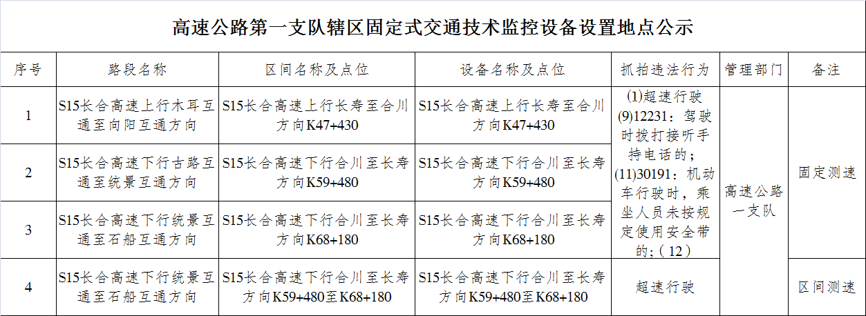 根据公安部《道路交通安全违法行为处理程序规定》(第157号令)第十六条第二款规定,现将高速公路固定式交通技术监控设备设置地点予以公布,详见下表。
